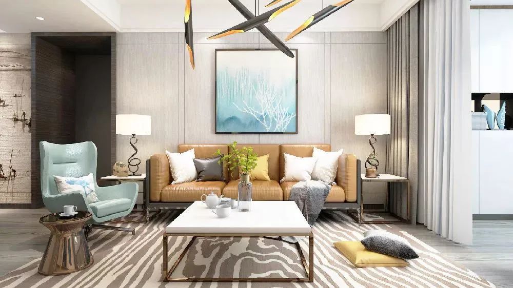 裝飾畫有藍色抱枕采用同樣的藍色;裝飾畫有橙色,抱枕和茶幾也利用橙色保持一致;地毯呢則可以和裝飾一致了。