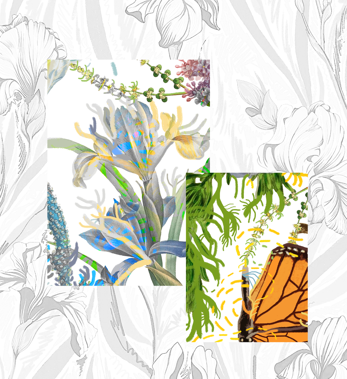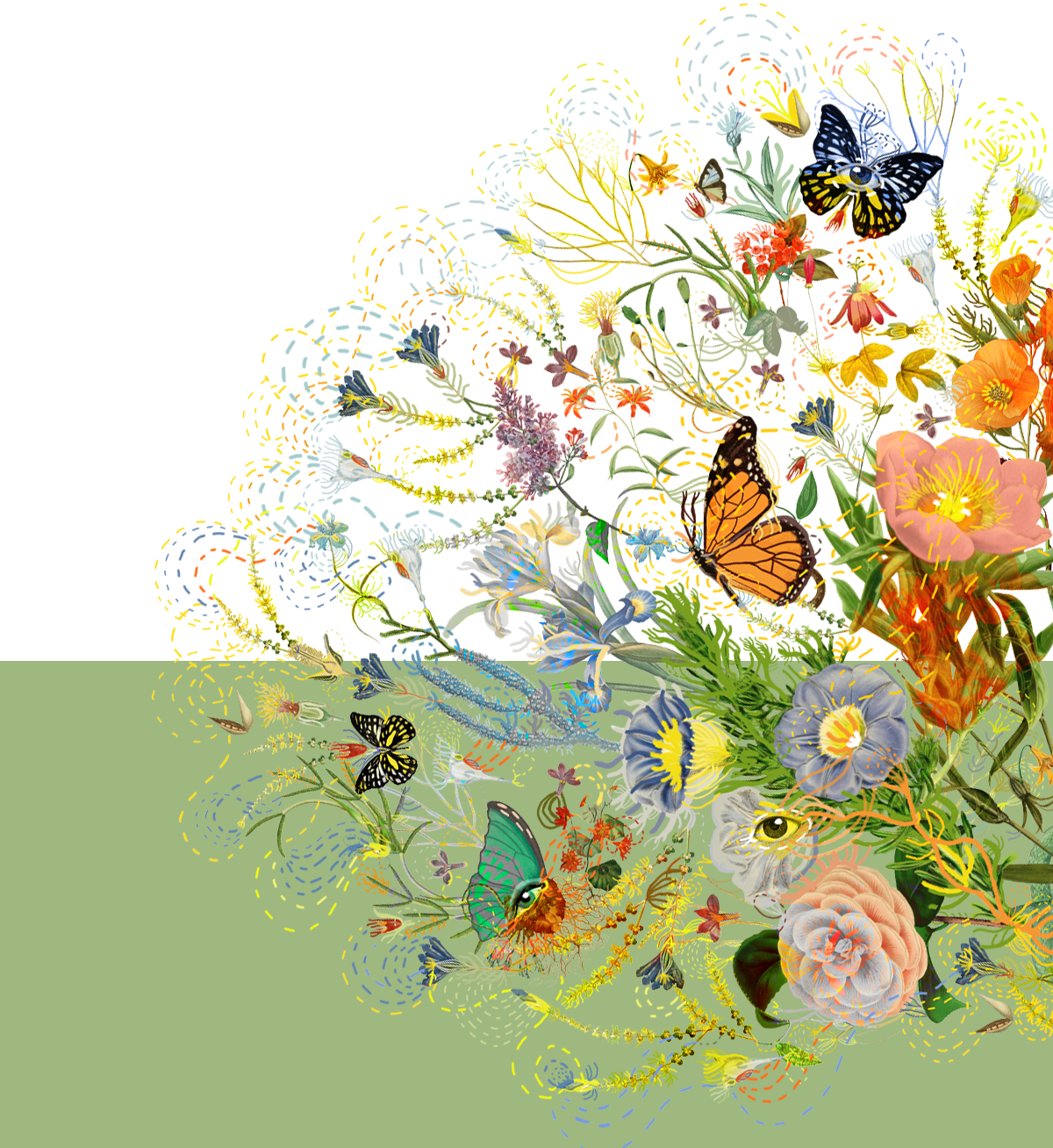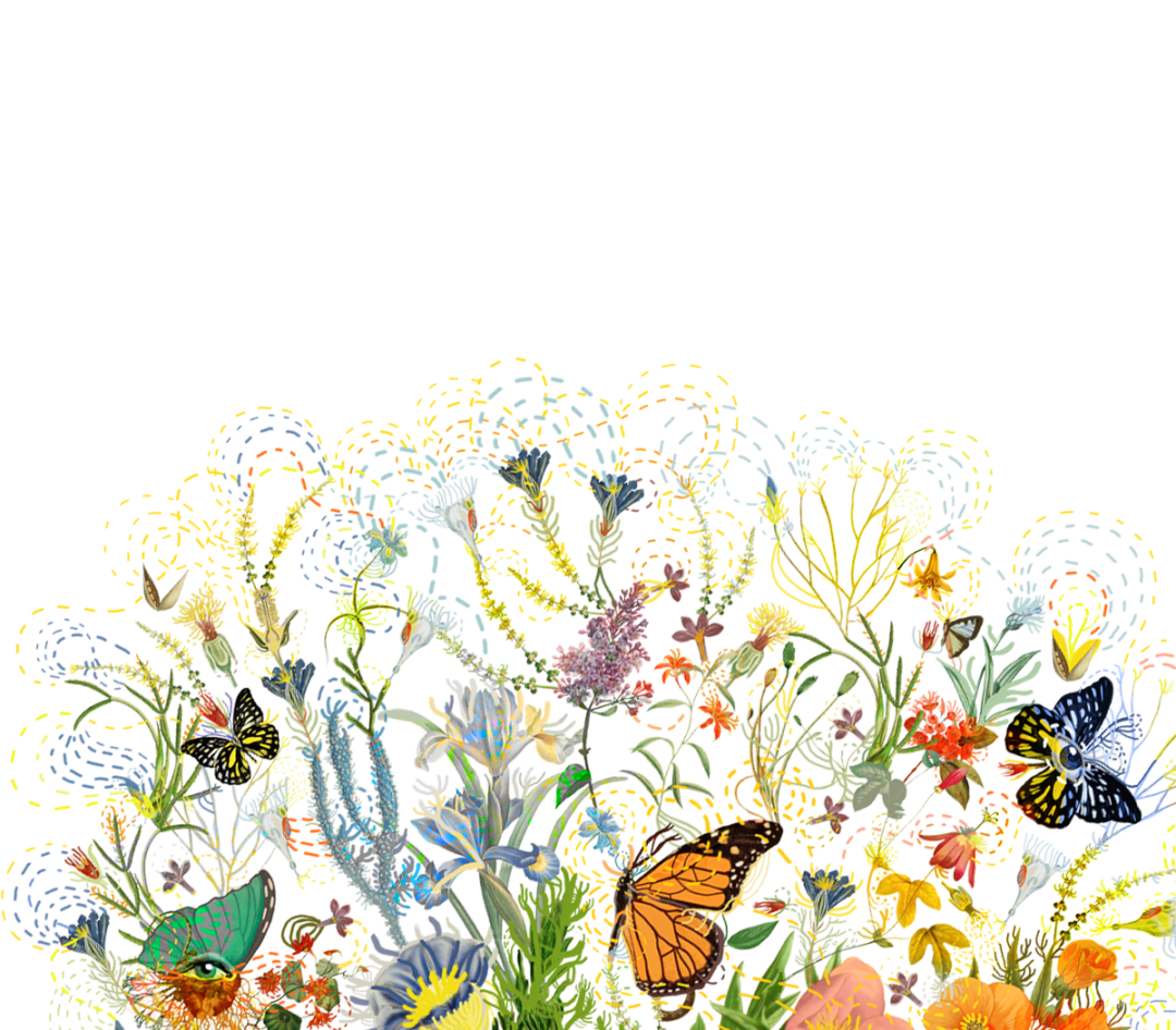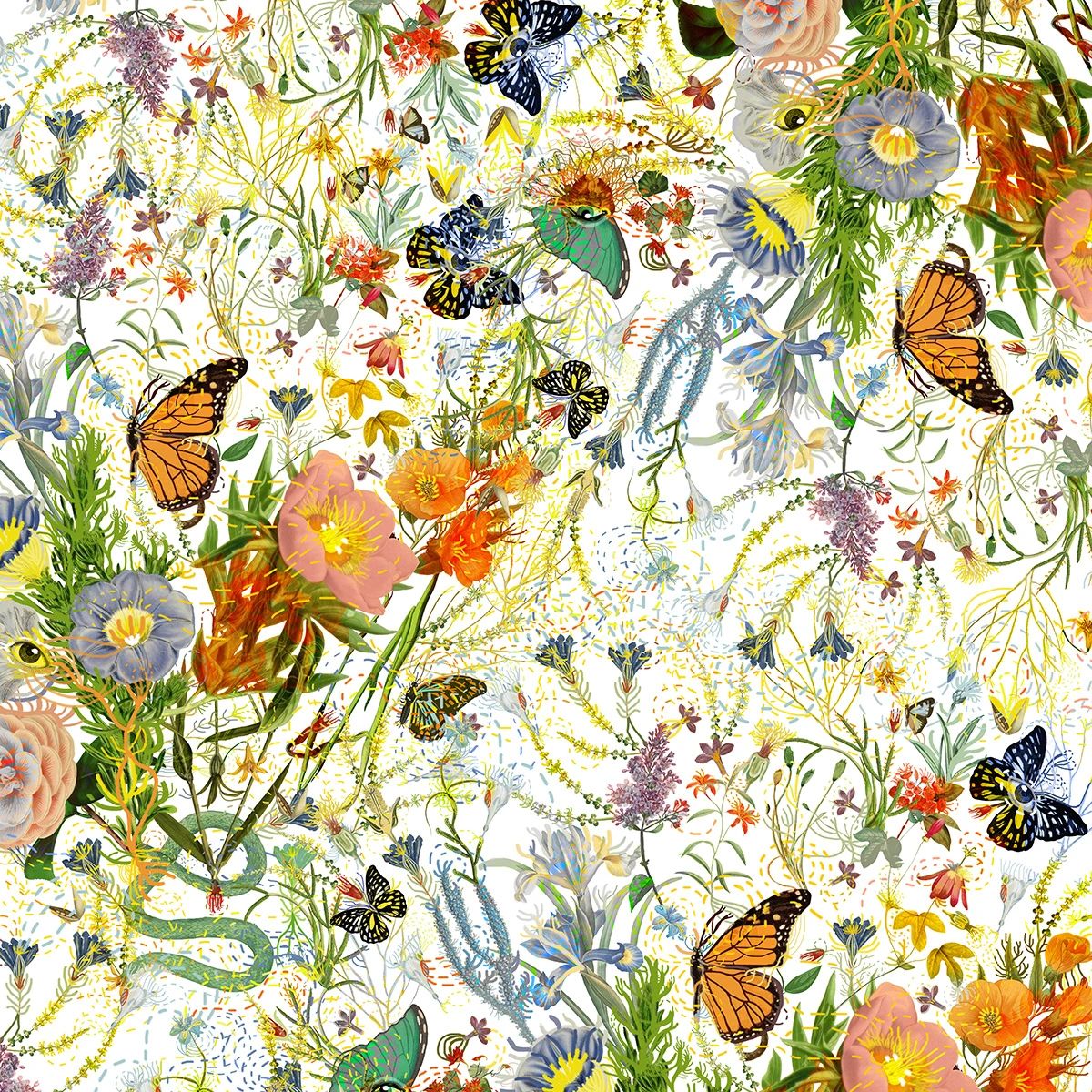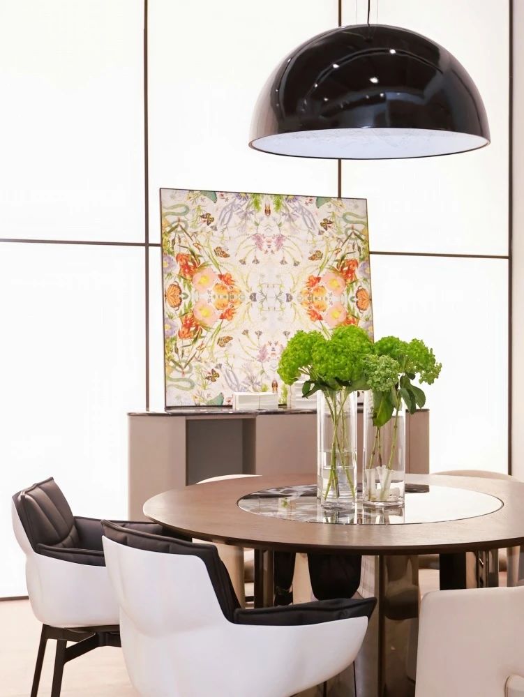 Paola以春日意大利花園為藍(lán)本,描繪了一個(gè)和諧靜謐的烏托邦:絢爛生長的鳶尾、木槿、牡丹,隨風(fēng)搖曳的枝蔓,沐浴在陽光下翩躚起舞的蝴蝶,交織鏈接的虛幻線條,共同構(gòu)成生機(jī)勃勃的能量場,為家注入不斷繁衍生長的生命力與治愈力。