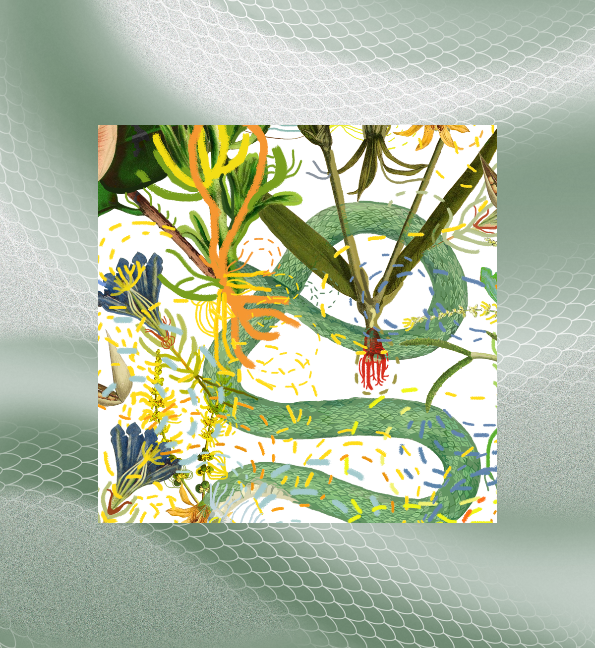 蛇在中國傳統(tǒng)文化中寓意靈動(dòng)、智慧與生命力,在意大利蛇亦是智慧、治愈與再生的象征,紋樣底部靈蛇蜿蜒的設(shè)計(jì),源自意大利經(jīng)典蛇形圖騰的造型,亦如同孕育萬物的根系催生出花團(tuán)錦簇的繁茂生機(jī)。