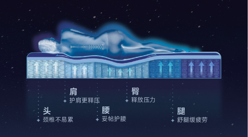 除了睡眠微環(huán)境調控,阿波羅床墊在支撐、釋壓與身體放松層面也形成了較完整的產品邏輯。其一方面通過更平衡的軟硬配比與分區(qū)承托,幫助脊柱在不同睡姿下更接近自然生理曲度,減輕局部受壓與肌肉持續(xù)做功;另一方面,通過更穩(wěn)定的人床界面狀態(tài),減少無效翻身與碎片化睡眠。