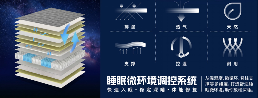 圍繞這些問題,該系統(tǒng)通過“透氣—導熱—濕度緩沖/隔離”的協(xié)同設計,幫助人床接觸界面更快建立起相對干爽、舒適、穩(wěn)定的狀態(tài),讓身體更容易進入放松節(jié)奏,也讓整晚睡眠更少被環(huán)境打擾。